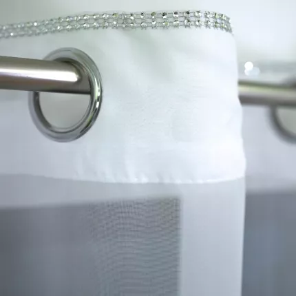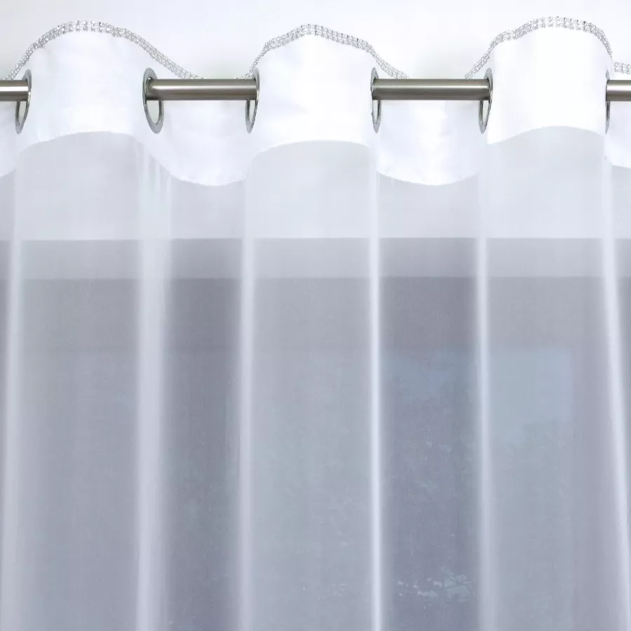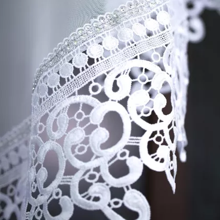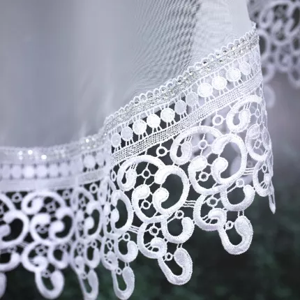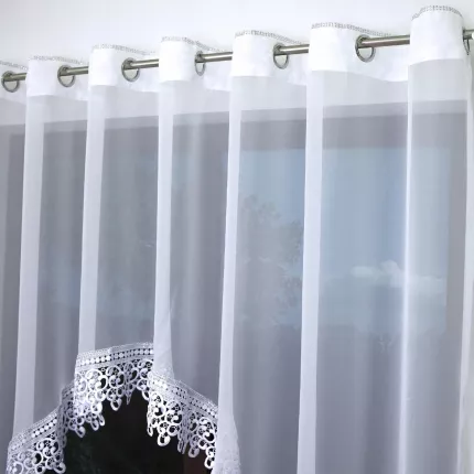 Firana gotowa woalowa 200x145 cm na przelotkach z dekoracyjną gipiurą dodatkowo ozdobiona delikatnym paskiem z cyrkoniami to elegancka i praktyczna ozdoba okna. Subtelny woal w kolorze bieli nada wnętrzu lekkości, a koronkowe wykończenie podkreśla szykowny charakter firany.
