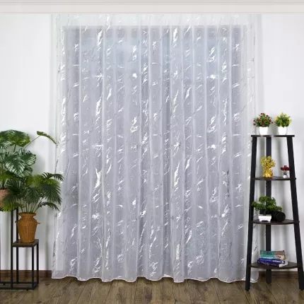 Delikatna struktura etaminy i srebrny wzór marmuru tworzą nowoczesną dekorację w stylu glamour.