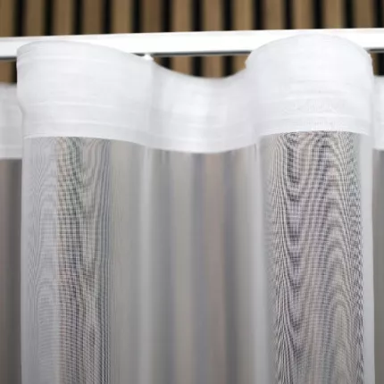 ? Wykończenie: Wszyta ołowianka (sznur obciążający) dociąża dół materiału, wymuszając równe układanie się fal i zapobiegając unoszeniu firany przy podmuchach wiatru.