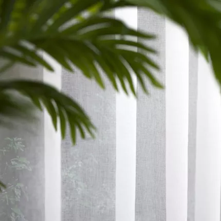 Gotowa do zawieszenia firana wykonana z materiału Etamina pozwala na odważne łączenie struktur w indywidualnych projektach. Jej jednolita struktura stanowi doskonałe tło dla aranżacji wnętrza, nie przytłaczając przestrzeni.