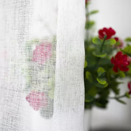 Gotowa do zawieszenia firana wykonana z materiału Etamina pozwala na odważne łączenie struktur w indywidualnych projektach. Jej jednolita struktura stanowi doskonałe tło dla aranżacji wnętrza, nie przytłaczając przestrzeni.