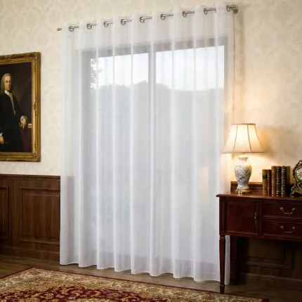 Gotowa do zawieszenia firana wykonana z materiału Etamina pozwala na odważne łączenie struktur w indywidualnych projektach. Jej jednolita struktura stanowi doskonałe tło dla aranżacji wnętrza, nie przytłaczając przestrzeni.