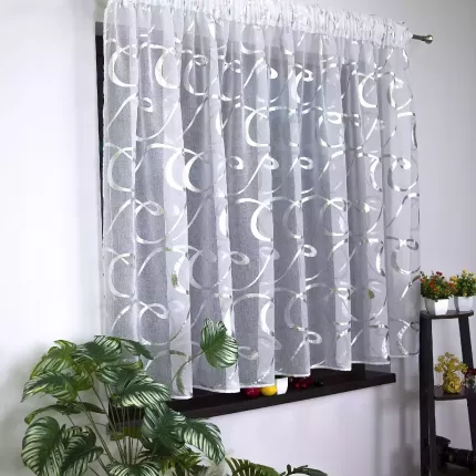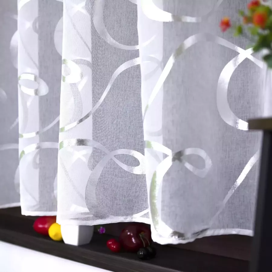 ? Nowoczesna firana gotowa uszyta z lekkiej, półprzezroczystej etaminy z dekoracyjnym nadrukiem.